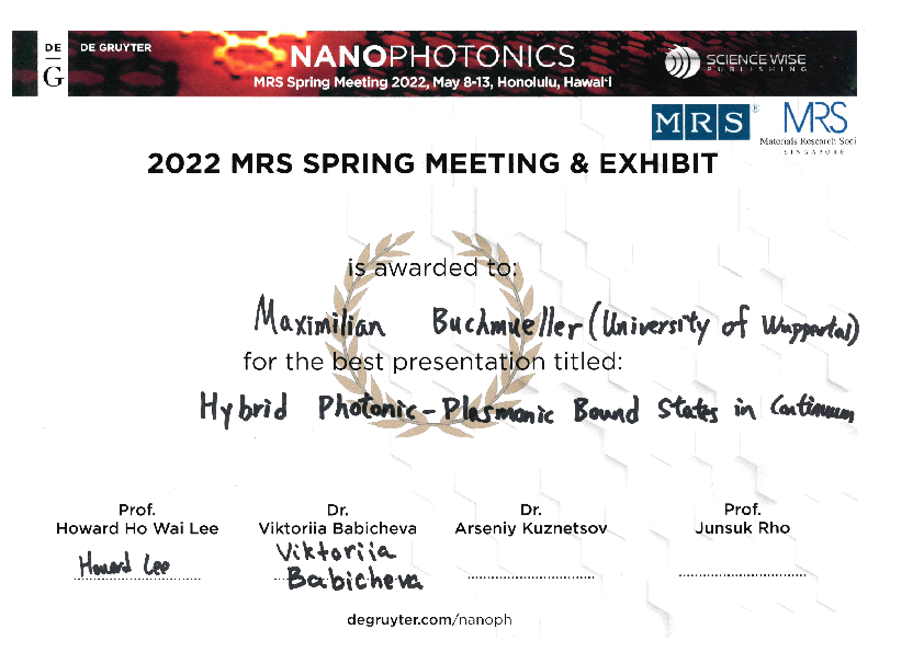 (Nanophotonics Best Student Presentation Award).
