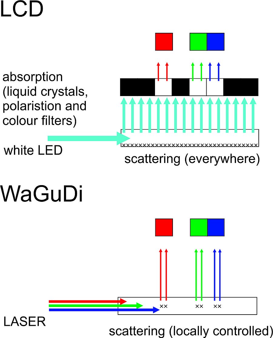 The concept of WaGuDi makes it possible for the first time to extract light from a waveguide in a precisely controllable place. This spot then becomes a luminous pixel of a WaveGuide Display. Different from current liquid crystal displays (LCDs), which extract light from the entire waveguide and thus define a picture by wasting energy, WaGuDi uses light only in the places it is needed. If no light is extracted, the respective pixel remains dark, while the light can be used for other pixels. Just like LCDs, WaGuDi can be illuminated with the most efficient light sources, especially with lasers, which considerably improves color rendering. Based on this concept, a display could be more efficient, more cost-efficient, lighter, and faster than previous displays. Moreover, these features may be reached without any backplane.